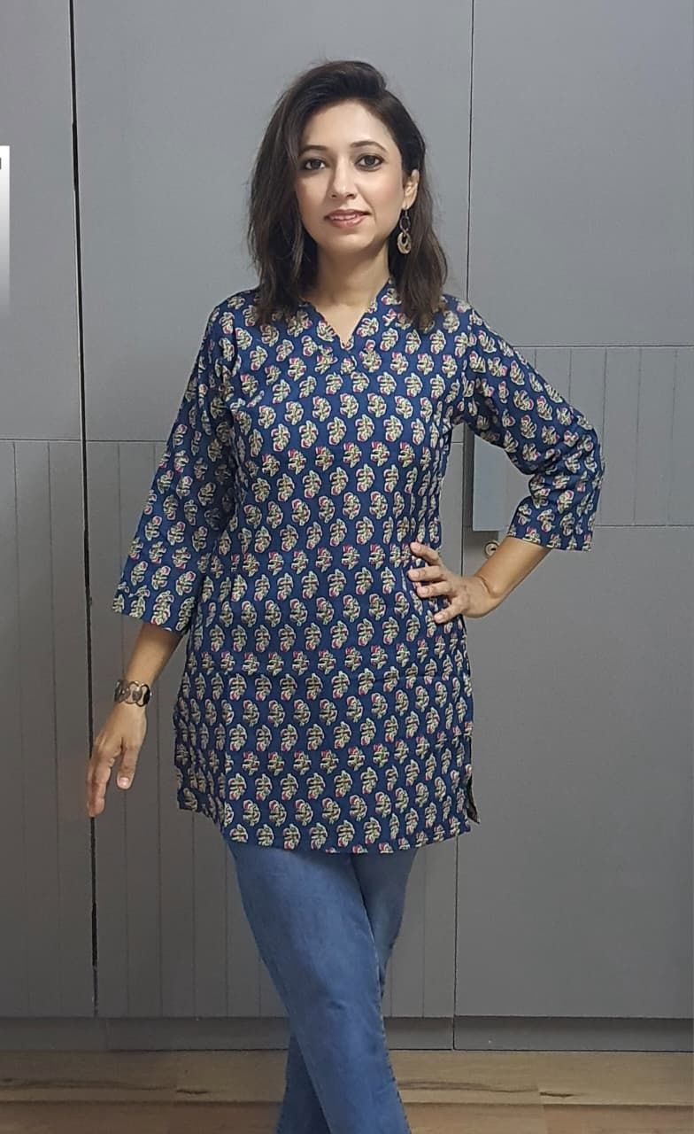 This tunic is made of pure cotton cambric fabric which gives excellent look. It has 3/4th sleeves with side slit. It has V neck patti pattern.